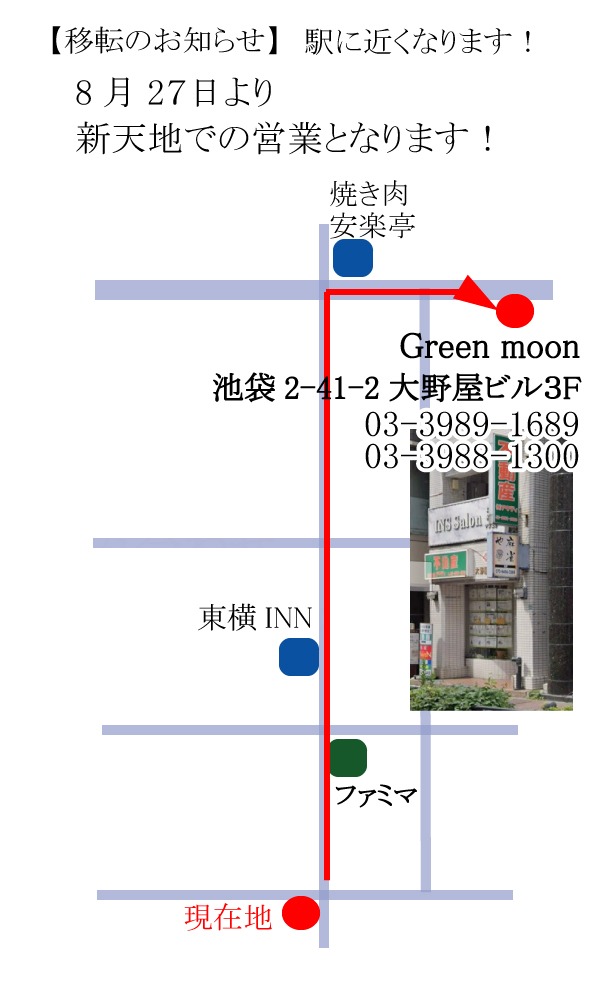 8月7日(火)より: 東京都豊島区池袋2丁目41-2大野屋ビル3Fで営業する運びとなりました。新しい場所は半個室になっております。